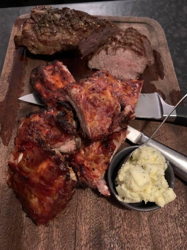 Colorado steak, barbecue ribben, bagt kartoffel, pommes frites, sauce bordelaise & sauce bearnaise + salatbar. Hvis man går sulten hjem, så er det selvforskyldt.